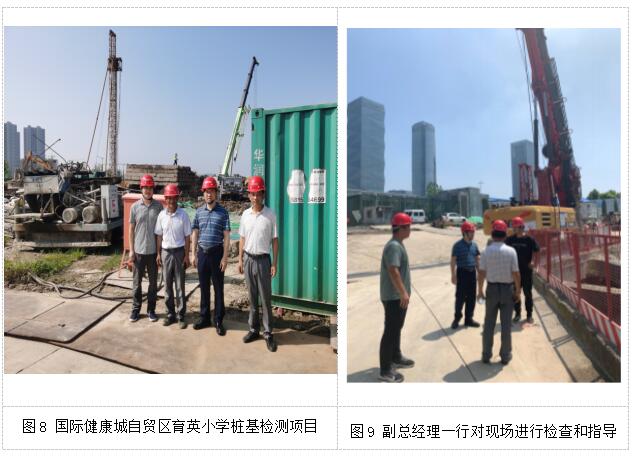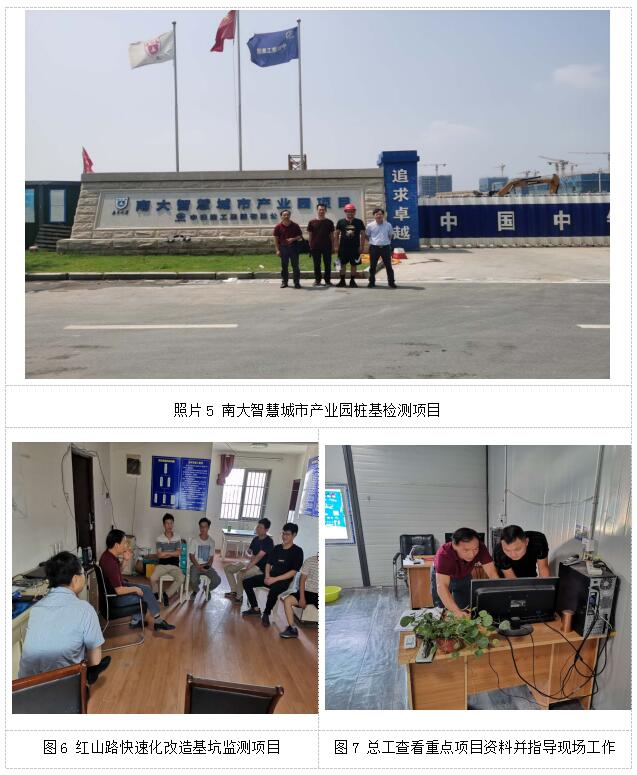 張志鋮、盧亮一行先后對國際健康城自貿區育英小學、銀城G38和金茂二期、奧體蘇寧恒大監測、檢測項目組的工作人員送上了防暑降溫用品、鹽汽水等慰問品,關切詢問了一線作業人員的生產生活情況,并與業主、監理現場親切交流;詳細詢問了檢測或監測項目現場工作的進展情況,并對檢測工地的自動化采集上傳系統、安全管控是否到位、現場吊裝采取的安全措施、監測的現場標化、防暑降溫措施落實情況等進行了檢查,對項目組如何更好地應對項目風險、提升現場形象、品牌建設等方面提出了很多寶貴意見(見照片8~9)。
